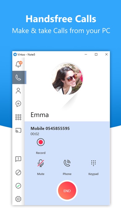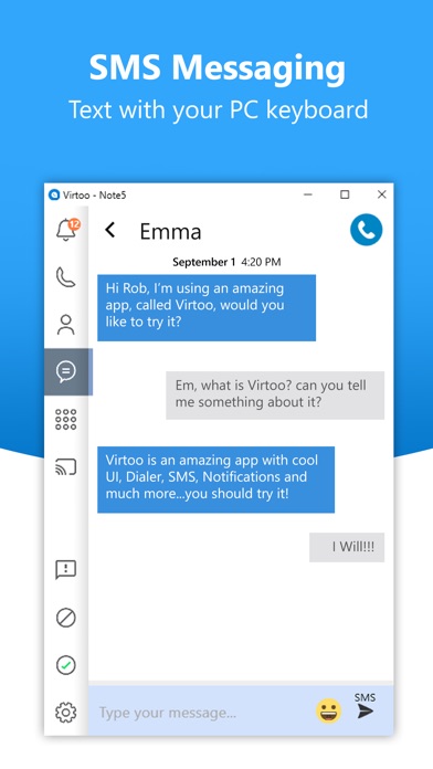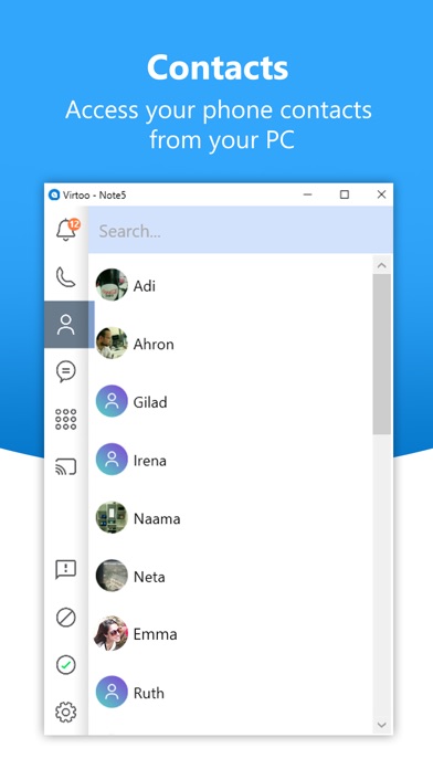 Virtoo extends your smartphone to the PC, allowing hands-free calls and SMS messaging. It provides integration between your PC and your phone. Leave your mobile device in your bag or on the desk and enjoy its functionality through the PC’s mouse, keyboard, and touch screen.