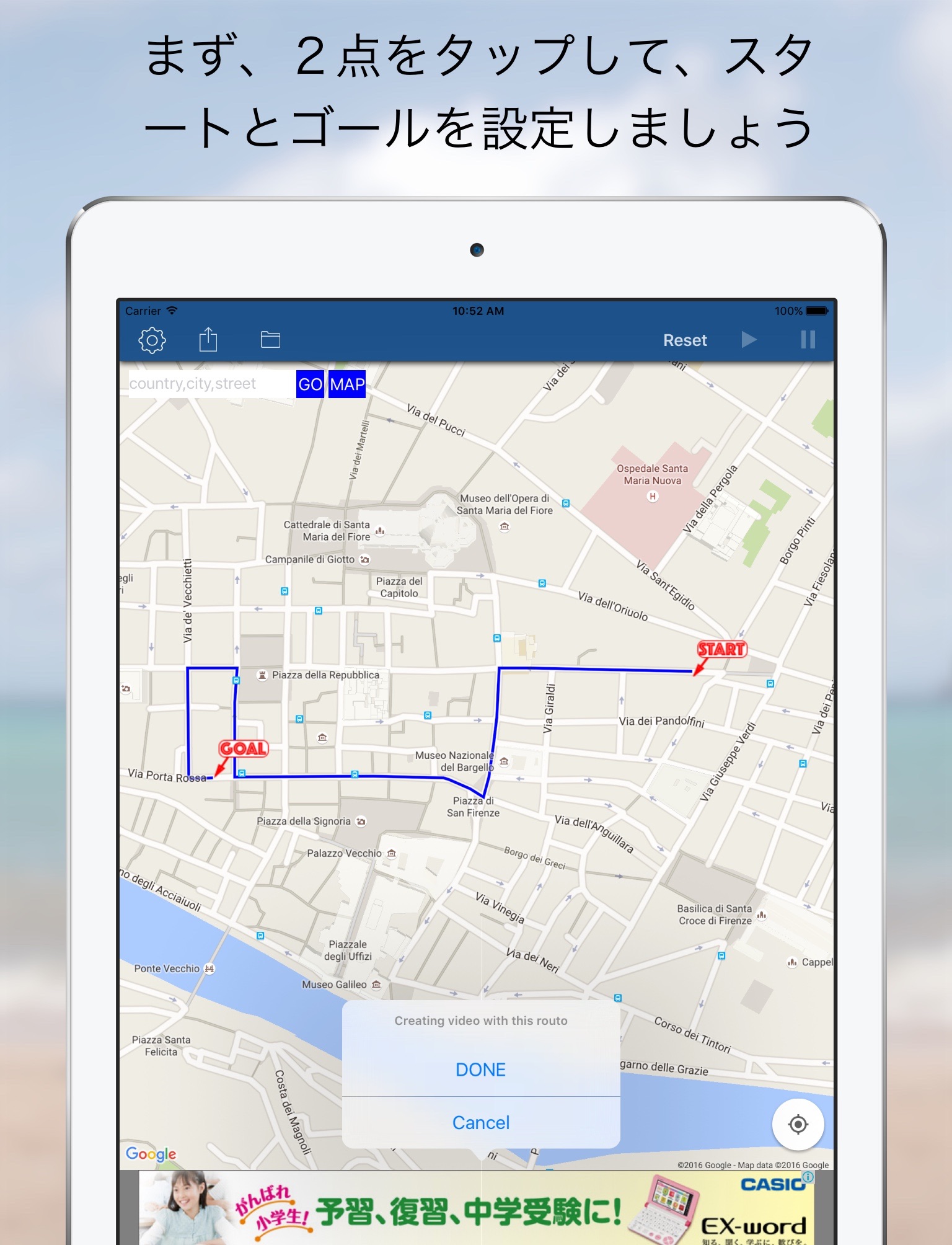 With simple 3steps , this app enable you to create route movies with Google Street View .