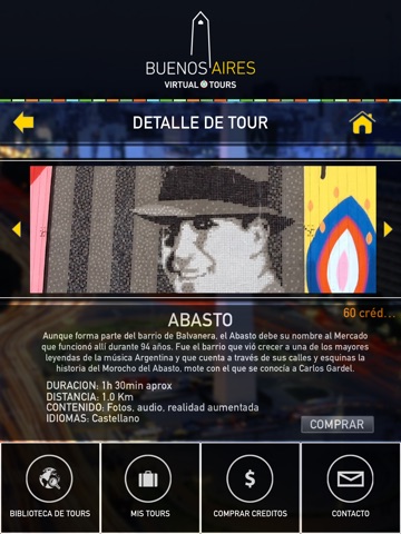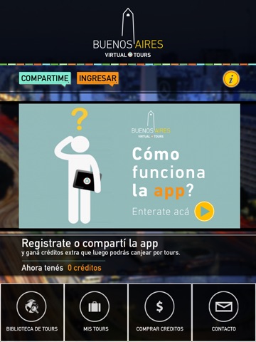 Desde la aplicación podrás descargar tours de forma gratuita o utilizando los créditos que obtendrás al registrarte, compartir la app o simplemente comprándolos.