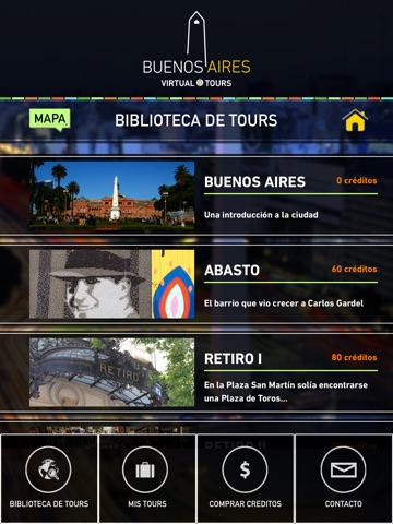 Entrando a la sección Biblioteca de Tours encontrarás el listado de los recorridos disponibles que podrás canjear por tus créditos.