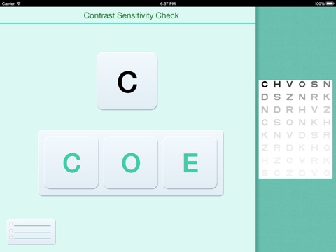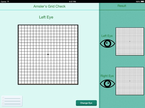 This check is designed to detect any kind of visual disturbance which may be caused by some changes in retina, optic nerve or the visual pathway to the brain. Look at the grid with each eye separately at the small dot in the center of the grid. Mark the grid if you see any wavy lines or some missing lines. The result of each eye is stored in iPhone device and can be referred by doctor to diagnose the actual location of problem. This check helps to diagnose any macular disease in the eyes.