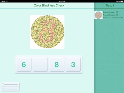 Color vision deficiency is defined as a lack of perceptual sensitivity to certain colors. Certain people cannot make out the difference between some couples of complementary colors. In this check (known as Ishihara Color Test) you are provided with series of pictures of colored spots. A figure is embedded in the picture as a number. You need to identity the number and select the appropriate answer from the options given besides the picture. The result card is generated showing your answer compare to the answer of a person with normal vision. You can share your result card with your doctor.