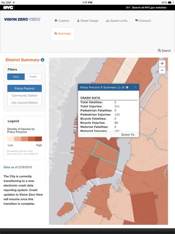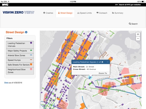 The Vision Zero View web application displays New York City traffic crash injury and fatality data, speed limits for all of the city’s streets, Vision Zero outreach program locations, and street safety construction projects. Detailed information for all of the displayed feature sets can be viewed within the application. Crash data is categorized by mode of transportation, and is grouped by year and by month. The summary view displays demographic data, traffic crash injuries and fatalities, and Vision Zero initiatives grouped by city council districts, community districts, and police precincts. The application provides a search tool to locate street addresses or intersections, a geo location button to find the user’s current location, and zoom/pan map functionality. All of the displayed data is publicly available in open geographic data formats, and can be downloaded through a link to the NYCDOT data feed page that is given in the application.