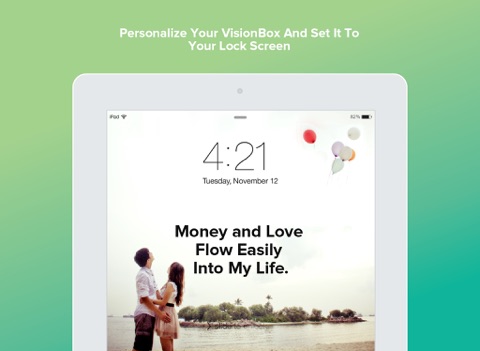 Eventually they said we need to share this with the world and do so in a beautiful way. Hence - VisionBox iOS 7 Law of Attraction Lockscreen. The VisionBox creators are motivated by the possibility of giving ambitious people a tool that can help them in their pursuit of their dreams.