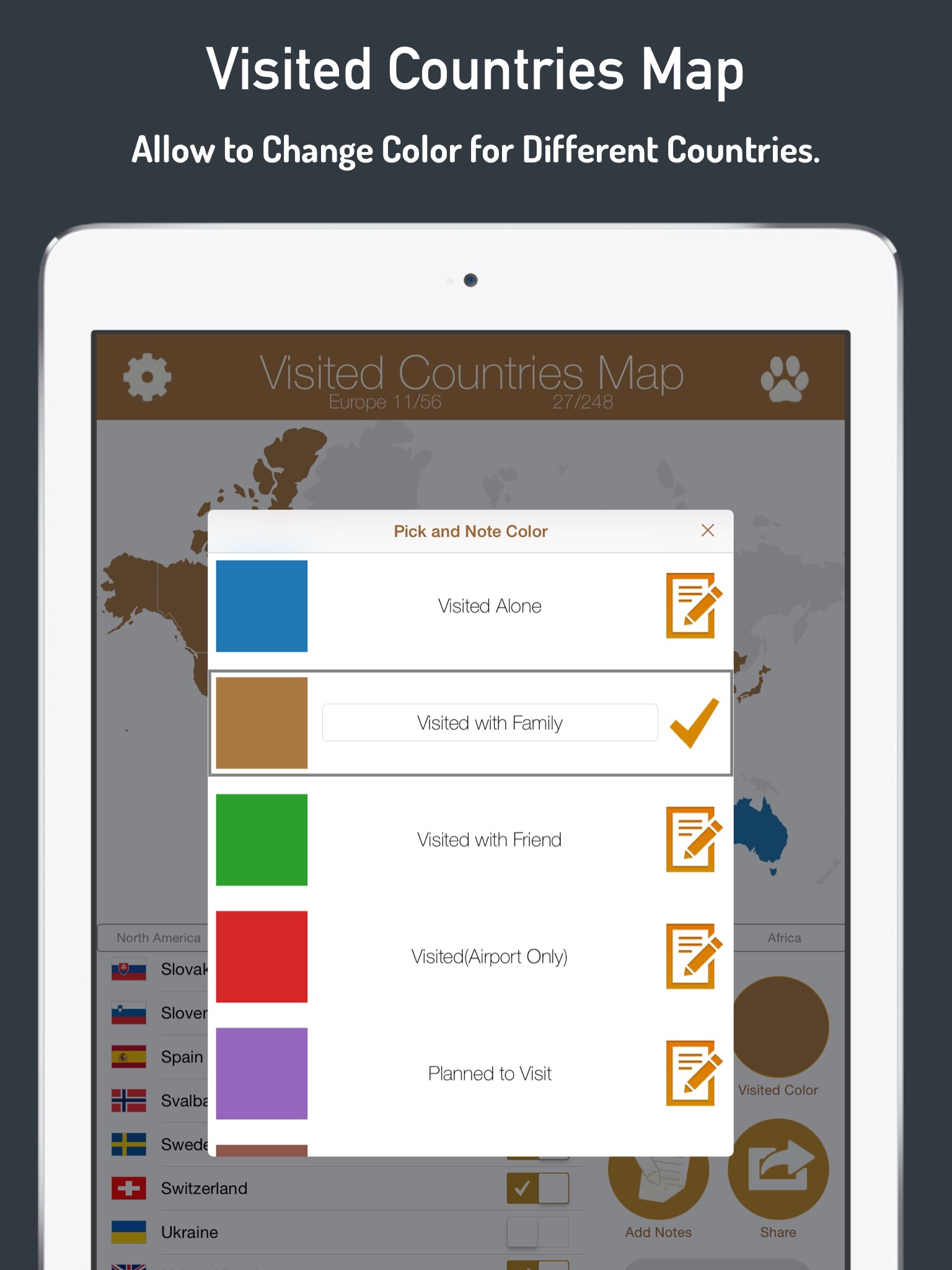 I like the idea of this app but it would be more useful with a color control per country, or by creating categories. For example: - countries visited, in green (exemple) - countries went through (airport only), in yellow - countries planned to visit in yellow - Countries would like to visit in blue - make your own category Currently, color control is either of one choice or random, it seems.