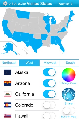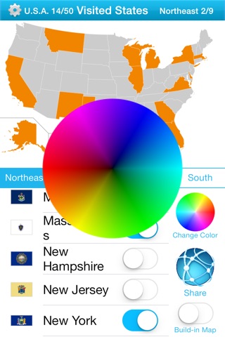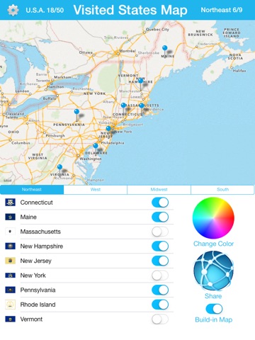 App is exactly what I wanted but I wanted to be able to use many colors together on the map to differentiate between states I have been to, states my husband went to and which ones we visited together.