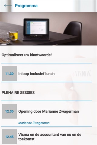 De app geeft informatie over de locatie en berekent de route voor u. Daarnaast vindt u informatie over het programma en achtergrondinformatie over de sprekers. Uiteraard ontbreekt de nodige productinformatie niet, net als de bedrijfsinformatie van Visma zelf. Gedurende de dag kunt u de app gebruiken om de twitterfeed te volgen.