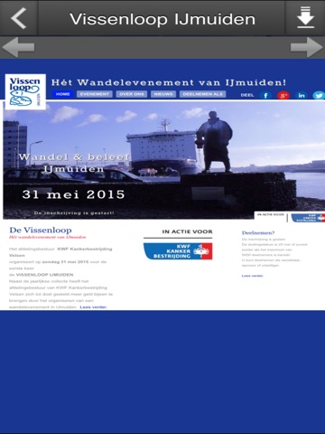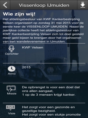 De Vissenloop IJmuiden is een nieuwe en mooie wandeltocht waar je kennis maakt met de mooiste locaties van IJmuiden en omstreken. Het wandelevenement heeft tot doel het ondersteunen van KWF Kankerbestrijding. De Vissenloop IJmuiden gaat uitgroeien tot een jaarlijkse traditie, waarbij vis en visserij niet zullen ontbreken. Het is de bedoeling dat via wandelaars en sponsoren jaarlijks een mooi bedrag wordt opgehaald voor het goede doel.