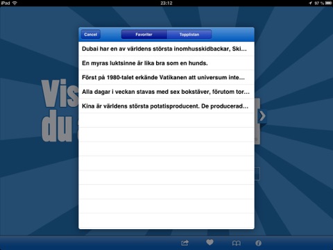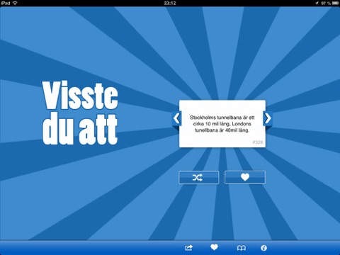 Appen innehåller över 400st roliga och intressanta påståenden om allt. Slumpa fram de, bläddra igenom de med fram- och bakpilarna eller blädra snabbt igenom alla i en lista. Appen har även en sökfunktion.