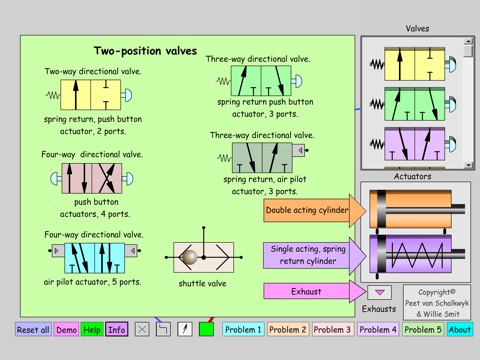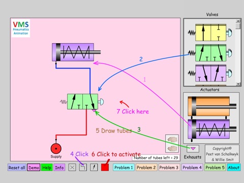 The user drags valves, actuators and exhausts to a design board, draw tubes, activate and then see an animation of how the design works!