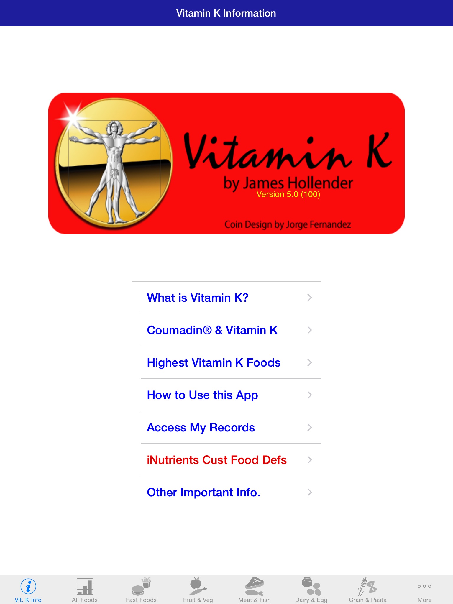 IMPORTANT: Before buying this app, consider the new apps that covers Vitamin K: INR Assist. It provides the same functionality including creating custom foods, changing the color scale, and all items in the USDA database instead of just a select percentage. The only difference between these new apps is labeling and documentation, so you just need one.