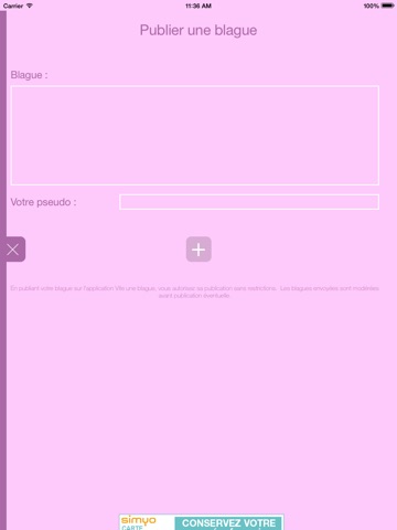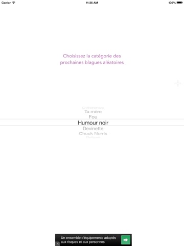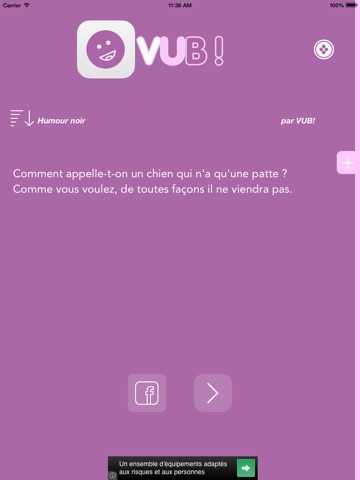 Vite une blague, lapplication qui vous propose des centaines de blagues choisies aléatoirement sur différents thèmes : humour noir, blondes, boulot, belges etc...