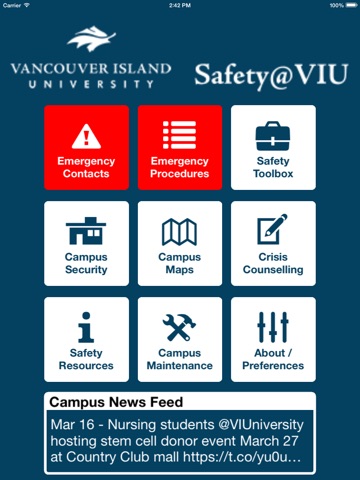 VIU Safety is the official safety app of Vancouver Island University. The app integrates with VIU’s emergency response plans and provides students, faculty and staff with up to date information. The app is used to send emergency notifications in real time and provides instant access to campus safety and emergency resources.