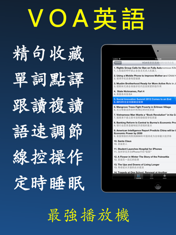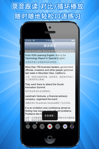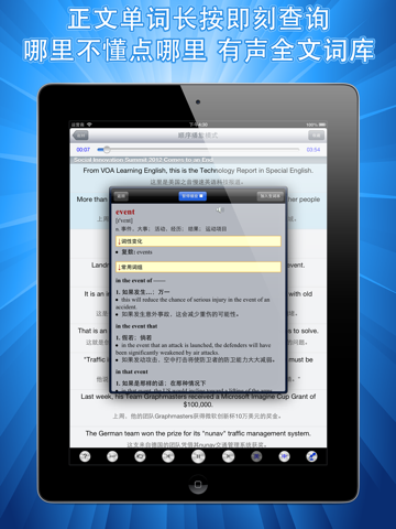 无需联网的语音英语学习软件。精心校对中英文字幕,支持后台播放、循环播放、逐句点读等多种播放学习模式,更加入了强大易用的录音跟读功能与单词点译,随点随查,快速直观。它会成为你学习英语最得力的助手与朋友!