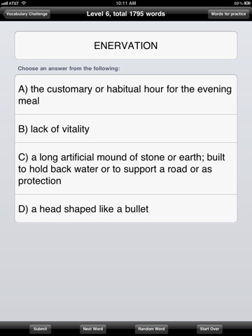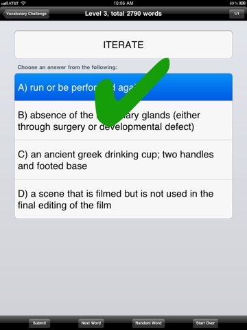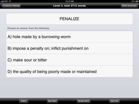 The vocabulary game divides the levels based on word length. You can choose to pause the game at any point of time at any level and return back later, and you can start from where you left off. Feedback on score will be provided instantaneously. You can practice the words that you answered wrong by pressing the score button. You can choose to select the words in sequence or at random. You can start over the game at any point of time.