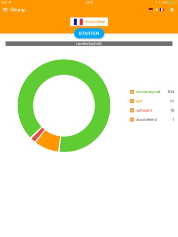 With the exercises, you playfully add new words to your vocabulary. You either have to choose the correct translation from a series of suggestions, find the correct word pair, choose the initial letter or put the letters of the translation in the correct order. Your learning progress is shown in a diagram at any time.