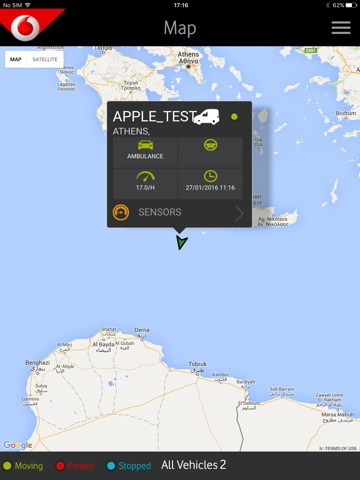 - Easily locate vehicles on the map in different colors depending on status. When selecting a specific vehicle, you can access more detailed information about the vehicle and its sensors (where available)