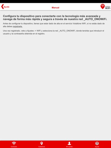 Con esta aplicación podrás registrarte y acceder a Vodafone WiFi, la red que permite a los clientes de Vodafone Ono conectarse en la calle como si estuvieran en su casa. Todo de manera muy fácil y a través de la aplicación, sólo necesitas seguir los pasos. Descárgatela para registrarte y, sólo cuando tengas cobertura (busca la red WiFi _AUTO_ONOWiFi), configura tu terminal. A partir de entonces, tu dispositivo se conectará automáticamente cada vez que tengas cobertura. Tienes 5 GB al mes para disfrutar del servicio en cada una de tus líneas móviles, si eres cliente de Internet + Fijo + Móvil.