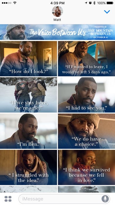 It’s everything you’ve always wanted to say (in the voice of Idris Elba). This iMessage audio app contains a selection of aspirational, inspirational quote messages from the new 20th Century Fox film The Mountain Between Us, performed by Idris Elba’s character Dr. Ben Bass. Download today.