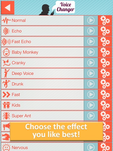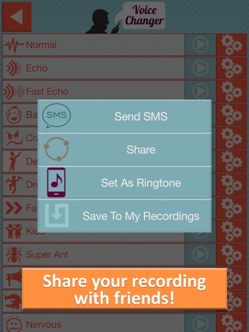 Beaucoup de voix de disponible mais malheureusement lorsquon sauve un enregistrement et quon lenvoi par sms la voix envoyée et reçue est la voix originale et non modifiée...ce qui rends cette application moins intéressante..!