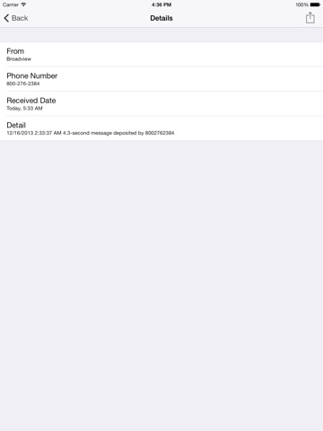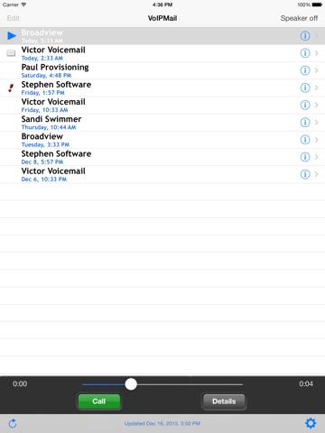 The VoIPMail application provides realtime access to your VoIP Service Providers voicemail. This app provides real-time access to your voicemail box including incoming push notifications as new voicemails are received. Your voicemails are displayed in a list fashion allowing you to quickly see all of your new and old voicemails, including the date and time they were received as well as the callers telephone number. If the callers number is a local contact on your phone, the name is also displayed. From there you can listen to the voicemail, mark it as old, delete it, or return the call. The playback provides quick and easy to use controls for fast forward and rewind. Actions performed in the app synchronize with your voicemail box, so marking a message as old in the app turns off the message indicator light on your desk phone.