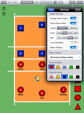 This app is great! I even emailed the developer to ask about exporting animation ti a video file and he said it would be in the next update sometime in Nov 2011! It has everything I need as a volleyball coach, and I especially like being able to save situations to load them later and show my team. The animations also work very well and give a good visual for the players to see what I want them to execute! Well done!