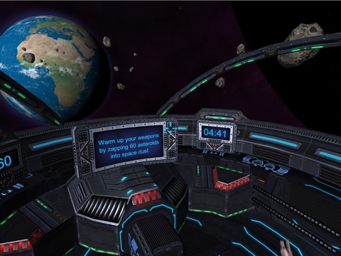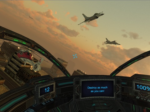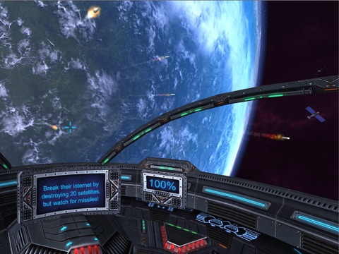 Extra care has been taken to ensure that VR Earth Attack is a superb experience for a VR newbie. During the opening level, the player is totally safe and can get adjusted to the intuitive "gaze to shoot" mechanic - there is no need to have a button on your headset (although if you have one, it can be used to select a highlighted item on the Options Menu rather than having to tap the screen). The second level introduces a slow but genuine threat from incoming ICBM missiles to gently increase the pressure on the player, with orbiting satellites coming from the sides. The final level is pure chaos, with an added sense of movement and sounds of the jet fighters racing past. Although players are destined to die during this suicide run, as their skill improves so will their survival time and score!