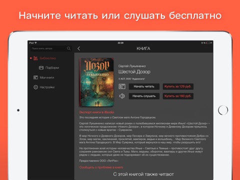 Приложение доступно к загрузке бесплатно, книги и аудиокниги внутри приложения платные. Следите с помощью push-уведомлений за промо-акциями, скидками и бесплатными раздачами книг.