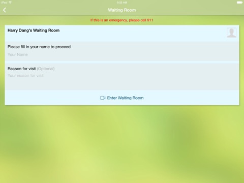 Seeing your provider is easy with Waiting Room. Simply enter your providers short room ID and you will be placed immediately in a virtual waiting room. From there you can have a face-to-face video call with your provider right on your iOS device.