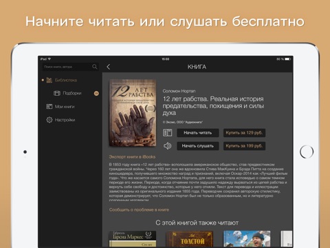 Приложение доступно к загрузке бесплатно, книги и аудиокниги внутри приложения платные. Следите с помощью push-уведомлений за промо-акциями, скидками и бесплатными раздачами книг.