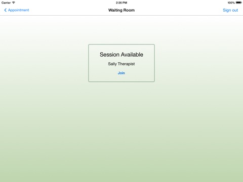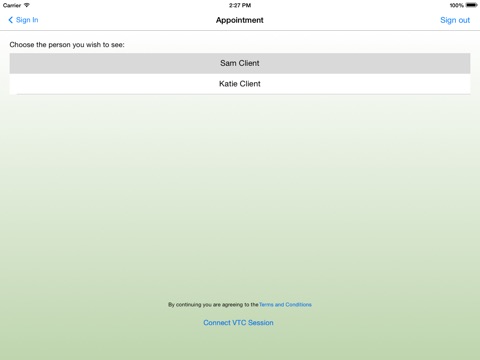 When it is time for a scheduled session, the practitioner and client launch VTConnect from their device. After securely signing in, the user will view the Appointment screen which lists all established connections. After selecting the appropriate person from the list, the user clicks the Connect VTC Session button. The client enters the Waiting Room screen until their practitioner arrives in the Treatment Room. Once the practitioner is ready for the session, the client will be able to click to join the Treatment Room. The session is completed when the practitioner clicks the End button.