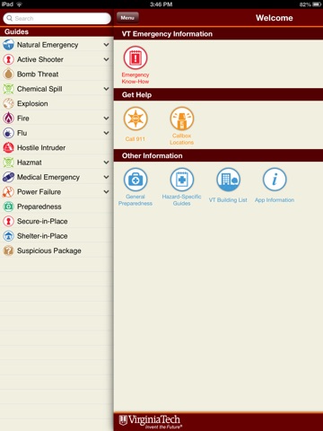 VTGemini is a universal iOS software application (app) running on iPhone, iPad, iPad Mini, and iPod Touch. It is developed to provide guidance and preparedness information to the Virginia Tech Blacksburg campus community before, during, and after an emergency caused by a natural disaster (e.g., earthquake, flooding, hurricane, tornado, winter storm) or a man-made disaster (e.g., active shooter, bomb threat, chemical spill, explosion, hostile intruder).