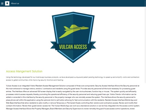 Mobile App and Web Base Interface that allow residents to add, modify or remove Temporary or Permanent Guest, controlling their vendors and contractors access. Review and modify their contact information. Review their guest/vendor access list. The Vulcan Mobile App can work as a standalone solution or can be fully integrated into the access control system.