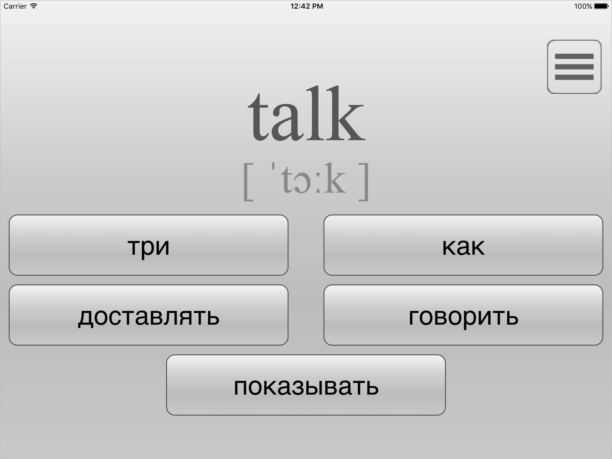 - принцип работы приложения: программа вразброс показывает английские слова (под словом размещена транскрипция, которая поможет правильно произнести слово, и предлагает варианты перевода на русский (украинский, белорусский) язык. Каждое английское слово программа выдает до тех пор, пока вы не выучите его. Приложение считает слово усвоенным, если вы правильно перевели его 5 раз подряд. Затем программа изымает из показов выученное слово.