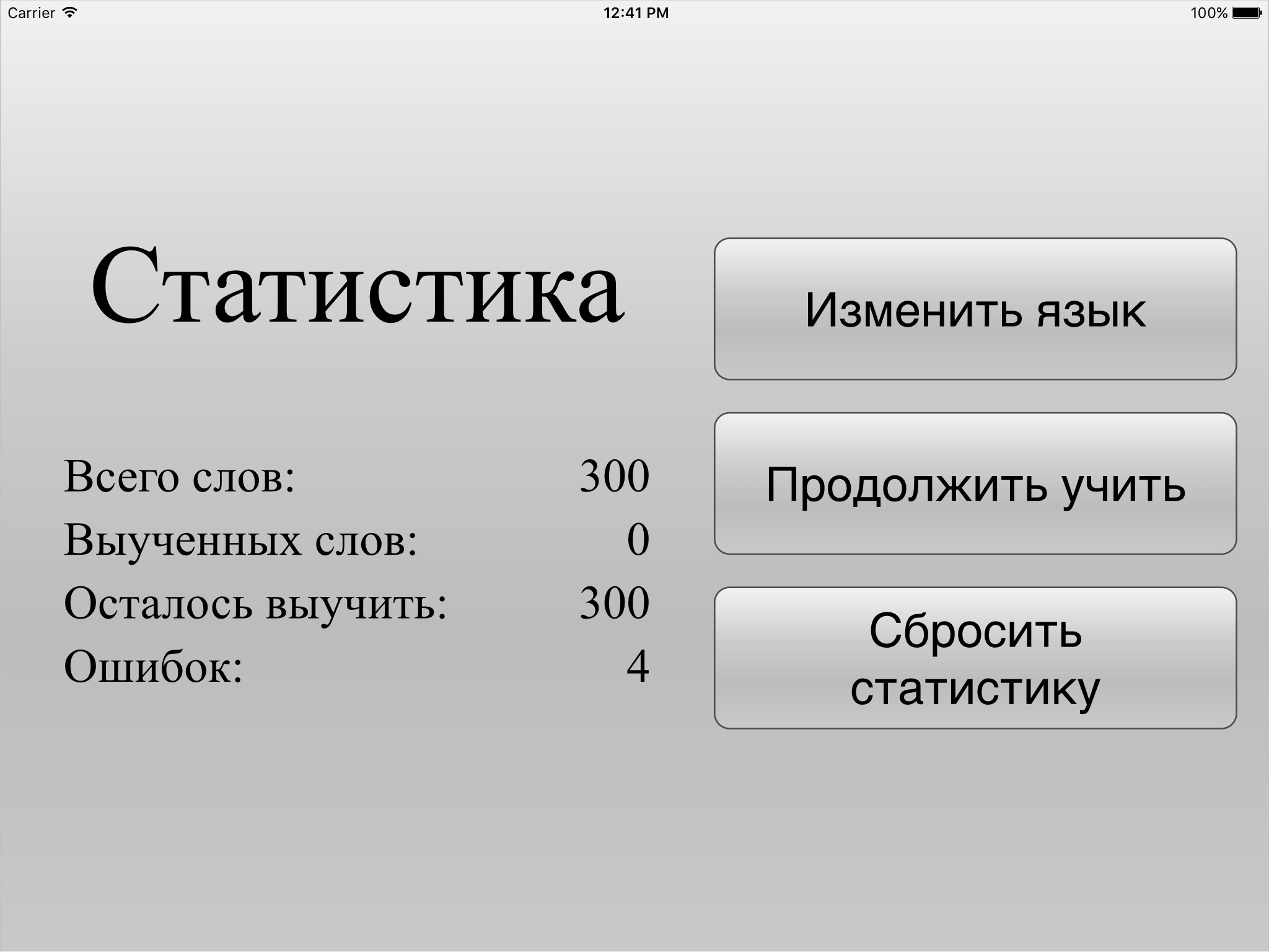 - в меню приложения находится статистика, в которой отражено, сколько всего слов выучено, сколько слов необходимо выучить, сколько ошибок допущено при изучении английского языка. В любой момент вы сможете сбросить данные статистики, а также изменить ваш родной язык или вернуться к изучению английского языка.