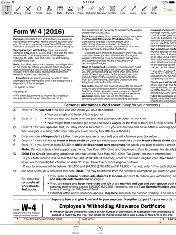 W4Form is a free IOS application that works on the IPad as well as the IPhone. You can use this application to quickly fill in W4 PDF form. Sign then print or email the filled out and digitally signed form to anyone.