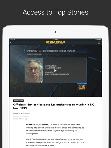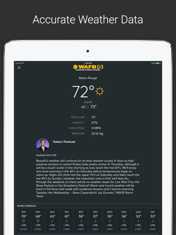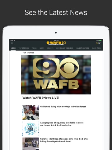 Live, local newscast from the #1 local news station in Baton Rouge, Louisiana. Watch 9News for local stories that matter to you, with live and on-demand newscasts and bonus content you can only find in this app. Get the latest forecasts with your First Alert Weather team, featuring live radar, hour-by-hour updates, and a 10-day forecast. Catch up on the latest investigations from the WAFB I-TEAM.