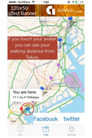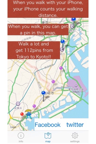 This app measure your your walking and running distance from the day when you begin this app. You can walk Tokaido Highway in the map of this app.