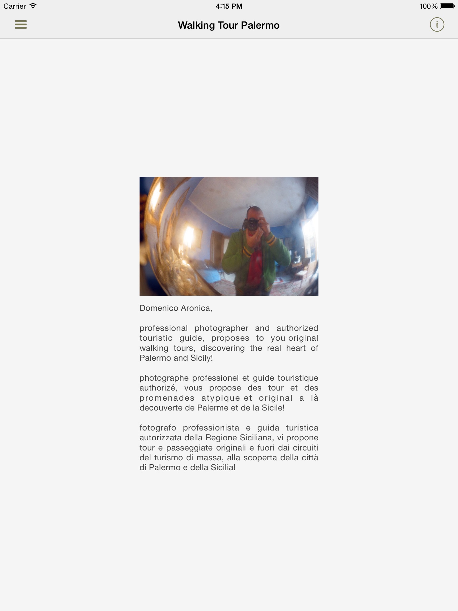 Ciao! Il mio nome è Domenico Aronica, sono nato a Palermo (1979) e sono un Fotografo professionista e Guida Turistica autorizzata della Regione Sicilia. Sono innamorato della mia città e ne conosco ogni angolo nascosto. Ti invito a prendere parte al mio originale Walking Tour alla scoperta del centro storico di Palermo, con la visita dei monumenti più importanti, ma anche vicoli, palazzi, siti Unesco, mercato storico e tipico street food. Divertiti nella mia bedda Palermo!