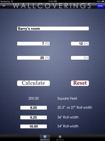 Simply type in the person’s name and the room being measured, along with the length and height of a wall(s). Press Calculate and in the blink of an eye, a complete itemization of the number of single rolls and yardage is displayed for the different size widths of wallcoverings. To reference your data press the blue Email button at the top and an automated editable message will appear in your email.