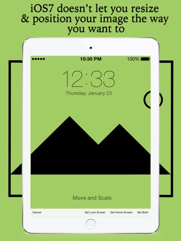 NOTE : iOS 7 needs wallpapers to be of a specific size. This app adds a border to your image so iOS 7 shows your wallpaper exactly how you want it to be in full view and in center of the view.