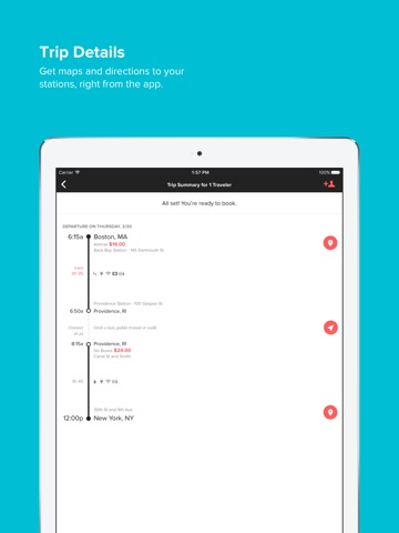 • Trip details – Access your itinerary and get directions to and from the bus and train stations.