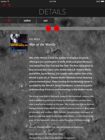 The War of the Worlds (by H.G. Wells) is presented by L.A. Theatre Works. This standalone audiobook app combines a professional audio recording with supplemental features for download-once, grab-and-go anywhere enjoyment.