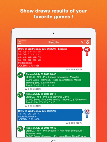 This App allows users to simultaneously access different results of draw games: bingo, lotto, horse racing, PMU Quinté +, Keno, Euromillion etc .. in a concise, simple and fun way.