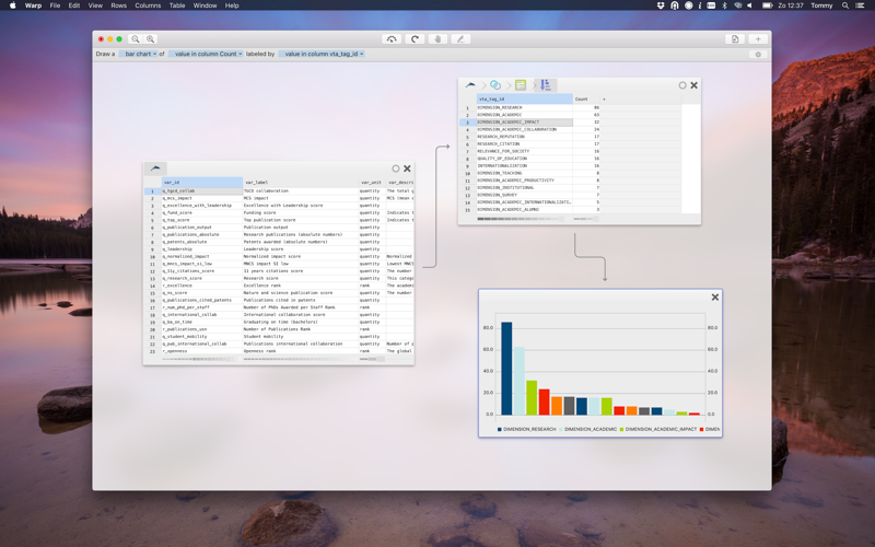 Warp allows you to convert and analyze (very) large databases with ease at the speed of light. In Warp, you work on a small subset of the data, after which Warp repeats your actions on the entire dataset. Unlike most data analysis apps, you do not have to type any codes in Warp.