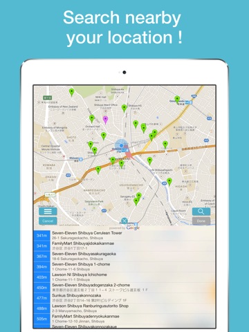 ◆ Search nearby stores, banks, stations and so on.