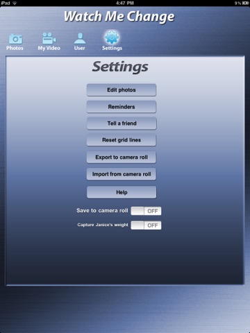 * Complete flexibility in taking the pictures of your body changing. There is no need to be in the same place or wearing the same things every day – the ghost image and gridlines take care of making your photos match up