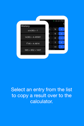 WatchCalc is the calculator on your wrist. Fully featured, yet simple. Use your AppleWatch to perform simple or scientific calculations, e.g.: