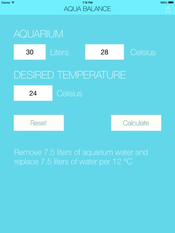 You specify the temperature of the water in your aquarium, the amount of water in the aquarium and the temperature you want to have the ultimate in aquarium. Water Balance indicates the water temperature and the amount to replace.