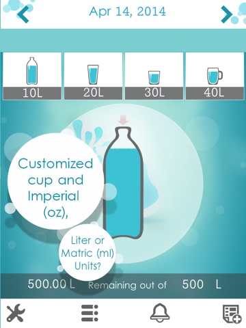 - Customized cup and Imperial (oz), Litre(L) or Metric (ml) units